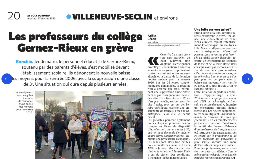Jeudi matin, le personnel éducatif de Gernez-Rieux, soutenu par des parents d’élèves, s’est mobilisé devant l’établissement scolaire ronchinois. Ils dénoncent la nouvelle baisse des moyens pour la rentrée 2026, avec la suppression d’une classe de 3e. Une situation qui dure depuis plusieurs années.