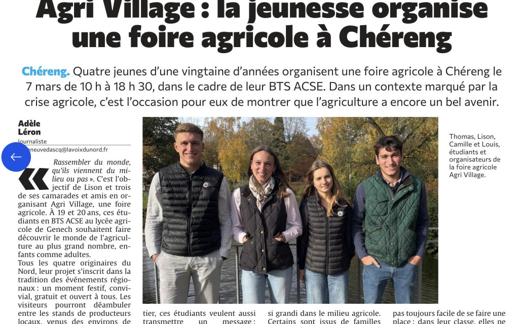 Quatre jeunes d’une vingtaine d’années organisent une foire agricole à Chéreng le 7 mars de 10h à 18 h 30, dans le cadre de leur BTS ACSE. Dans un contexte marqué par la crise agricole, c’est l’occasion pour eux de montrer que l’agriculture a encore un bel avenir.