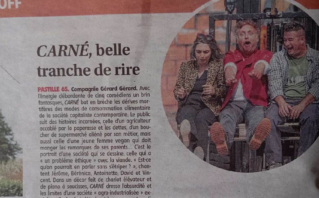 Court texte sur la pièce animaliste "CARNÉ" de la compagnie Gérard Gérard pour les coups de cœur de La Montagne pendant le festival d'Aurillac. Publication en ligne : https://www.lamontagne.fr/aurillac-15000/loisirs/theatre-de-rue-d-aurillac-nos-cinq-coups-de-cur-de-la-premiere-journee_14736805/