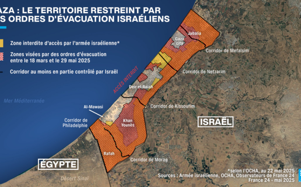 Entre le 18 mars et le 29 mai, l’armée israélienne a publié 32 ordres d’évacuation. Selon l’analyse de la rédaction des Observateurs, 78 % du territoire est concerné par au moins un de ces ordres. Deux millions d'habitants de Gaza sont censés se retrancher sur un territoire de moins de 65 km².