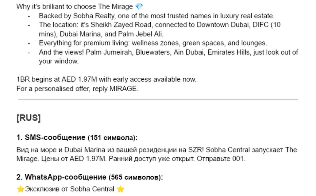 Crafted high-converting SMS (≤160 characters) and WhatsApp messages (≤600 characters) for first contact with leads in the luxury real estate segment, highlighting developer trust, prime location, entry prices, lifestyle benefits, and investment potential.