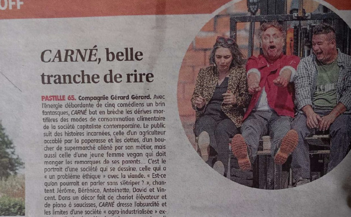 Court texte sur la pièce animaliste "CARNÉ" de la compagnie Gérard Gérard pour les coups de cœur de La Montagne pendant le festival d'Aurillac. Publication en ligne : https://www.lamontagne.fr/aurillac-15000/loisirs/theatre-de-rue-d-aurillac-nos-cinq-coups-de-cur-de-la-premiere-journee_14736805/