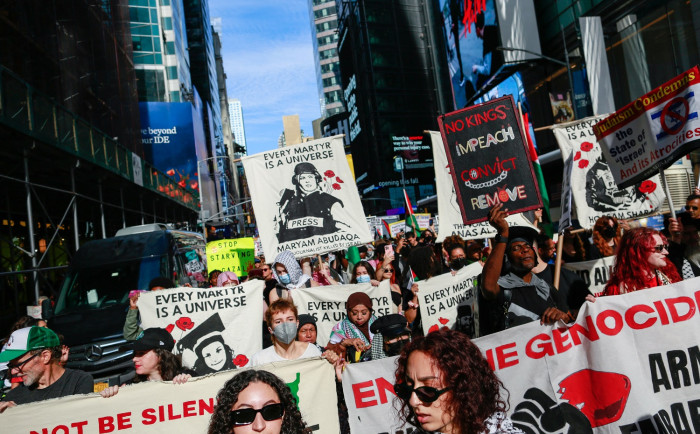 Alors que le chef du gouvernement israélien parlait devant un auditoire clairsemé, dans le cadre de l’assemblée générale des Nations Unies, une manifestation partait de Times Square ...