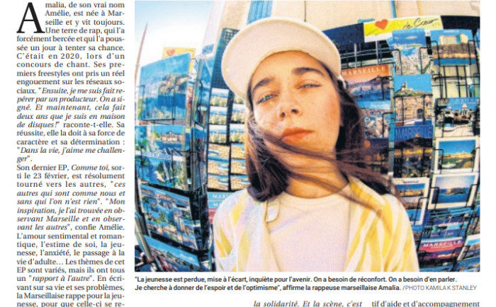 Interview pour les pages culture de La Provence. À 24 ans, Amalia, qui a sorti son 2e EP, "Comme toi ", vient d’être sélectionnée pour faire partie du Chantier des Francofolies, prévues à La Rochelle en juillet.